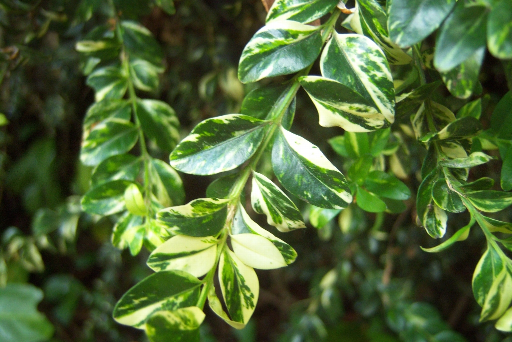 Le buis 'Elegantissima' est une variété de buis dont le feuillage est panaché. Les feuilles sont vert sombre irrégulièrement marginé de blanc gris crémeux, de forme ovale et étroite, ondulant,